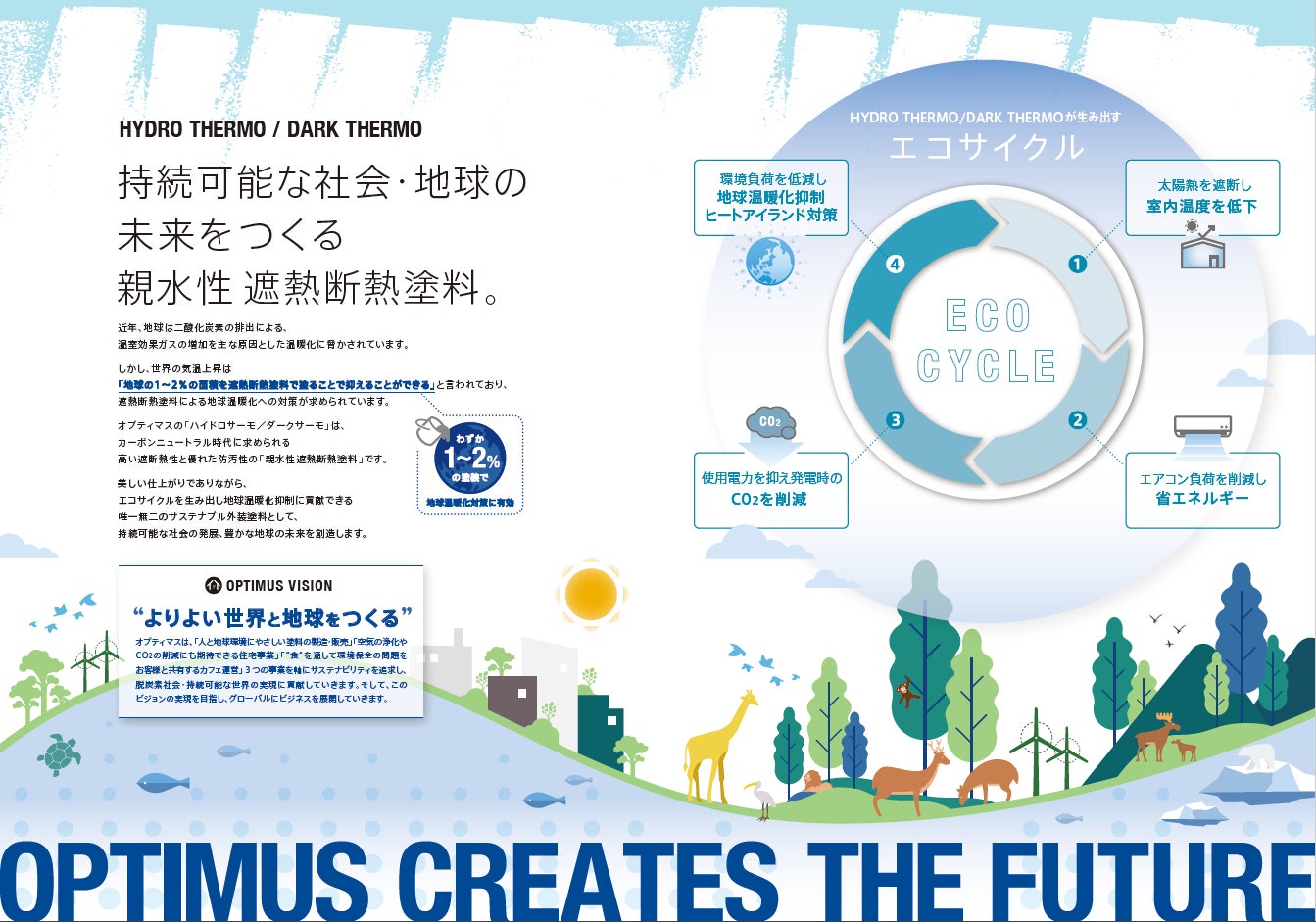 次世代型光触媒塗料の開発・販売を主軸とした事業で、サスティナビリティを追求するライフスタイルカンパニー、株式会社オプティマス(本社:大阪市中央区、代表取締役:高尾一美)では、地球温暖化対策に貢献する従来の外装塗料「ハイドロサーモ・ダークサーモ」と、「オプティマスホワイトペイント」の改良研究に取り組み、この度2024年4月に“さらに地球環境に優しく・カーボンニュートラルに貢献できる新・改良版の外装塗料”を販売することになりました。