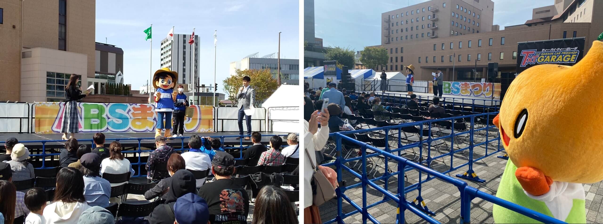 お笑い芸人やアイドルを中心にしたステージ、グルメ屋台、テレビやラジオの生放送、YouTube配信で盛り上がったABSまつり。ステージイベントでは、あきた海ごみゼロプロジェクトを推進するキャラクターのシンボル三平くんもステージに登場しごみ削減や、拾い箱プロジェクトを紹介し、会場の皆さんへ周辺のごみ拾い活動を呼び掛けました。ステージで頑張る三平くんをABSの広報課長のヨンチャンが見守ります。
