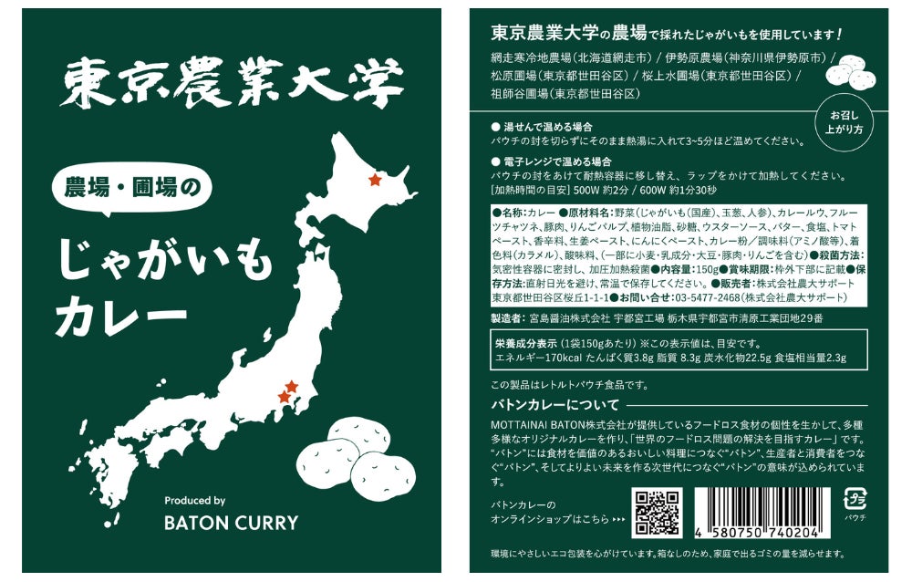 レトルトカレーにより食品ロス削減を図るMOTTAINAI BATON株式会社(本社:東京都国分寺市、代表取締役:目取眞 興明 めどるま こうめい、以下、モッタイナイバトン)は、2023年11月3日(金)に『東京農業大学じゃがいもカレー』を当社公式オンラインショップ、東京農業大学アンテナショップにて発売します。