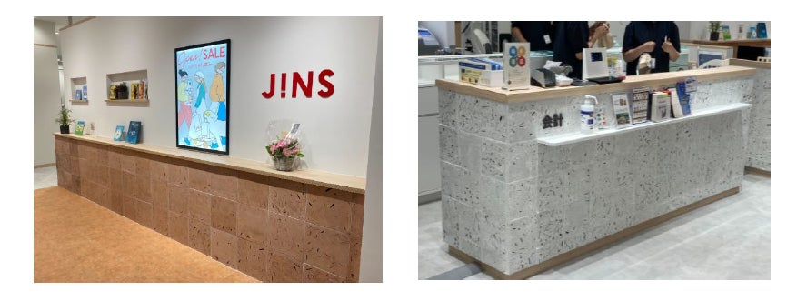 株式会社ジンズ(本社:東京都千代田区、代表取締役CEO:田中 仁)がリニューアルオープンした「JINS小田原ダイナシティ店」にて、ジンズ店舗内で使わなくなり回収した約900本分のアイウェア(※3)を、循環型セメントパネルに加工することで、店舗のカウンター、スツールや本棚の一部として新たに生まれ変わりました。アイウェアを焼却処理することなく制作し、約45㎏のCO2排出量(株式会社ジンズがアイウェアの廃棄で排出するCO2排出量の約0.05%)の削減に貢献しました。