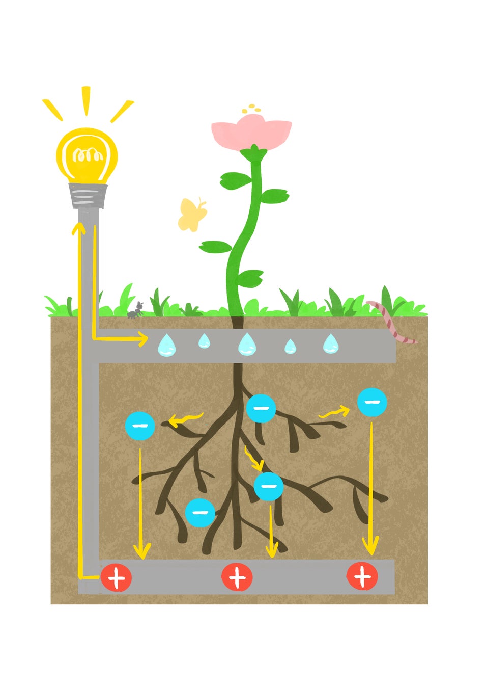 植物が光合成をすることで活発になる土壌または水中にいる微生物の働きにより生まれる電力で発電します。