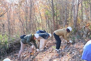 班に分かれて伐採跡地に約750本の広葉樹の苗(イロハモミジ420本、ヤマザクラ60本、ヤマボウシ100本、ケヤキ50本、カツラ60本、エノキ60本)の植樹を行いました。