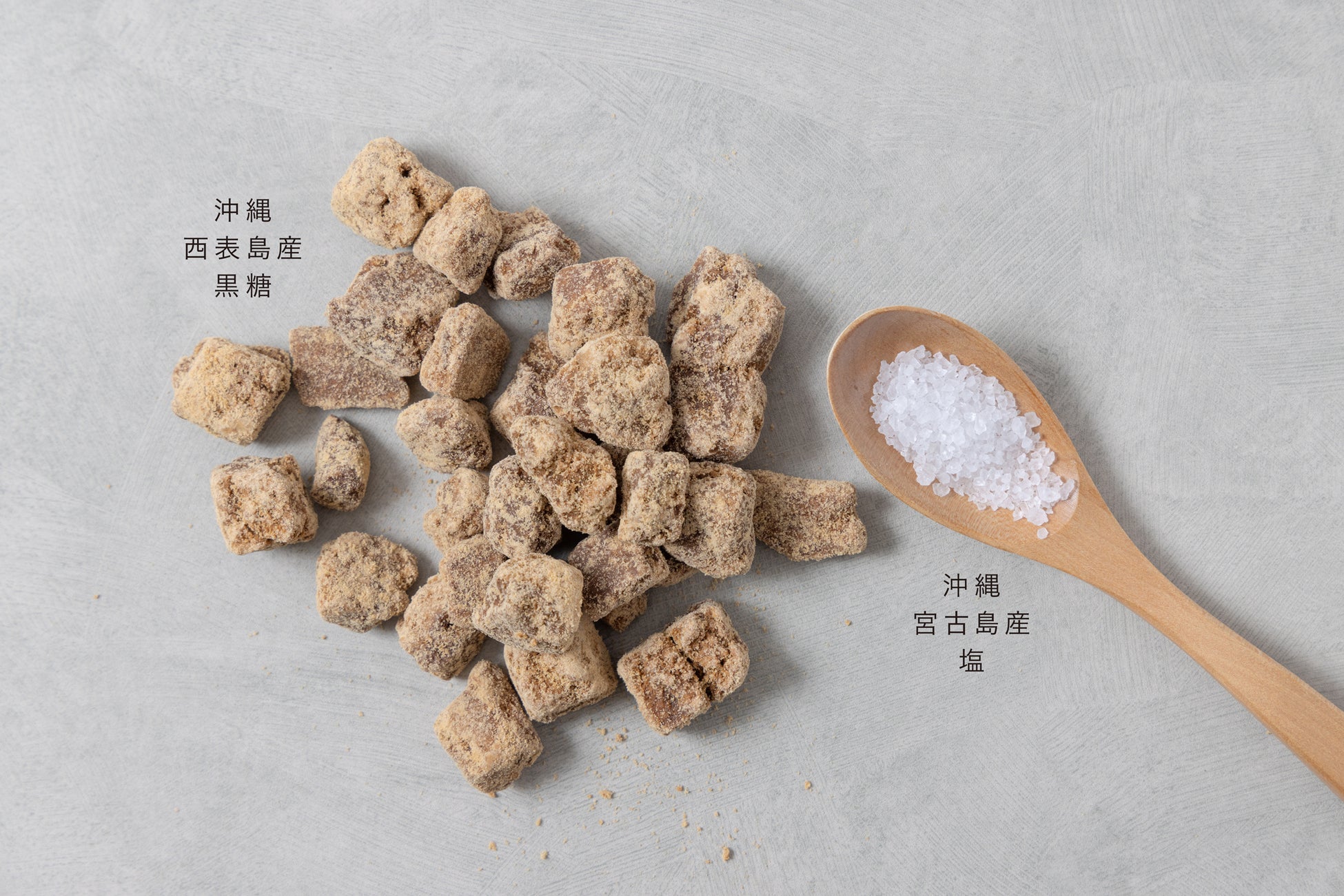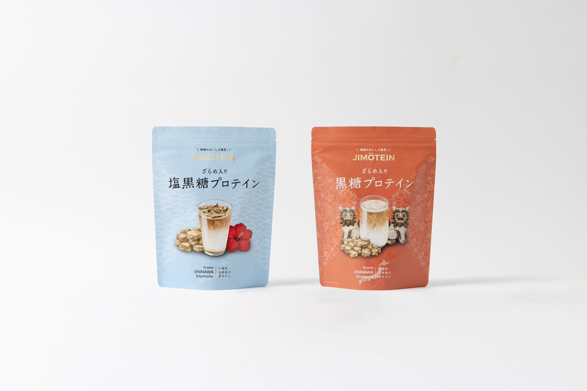 強い甘みとコクの深さが特徴の西表島の黒糖を使った、じゃりじゃりしたザラメの食感が新しいプロテイン。黒糖の優しい甘みをたっぷり楽しめる黒糖味と、ミネラル豊富な宮古島の塩がキリッと効いた塩黒糖味の2種類をラインナップしました。