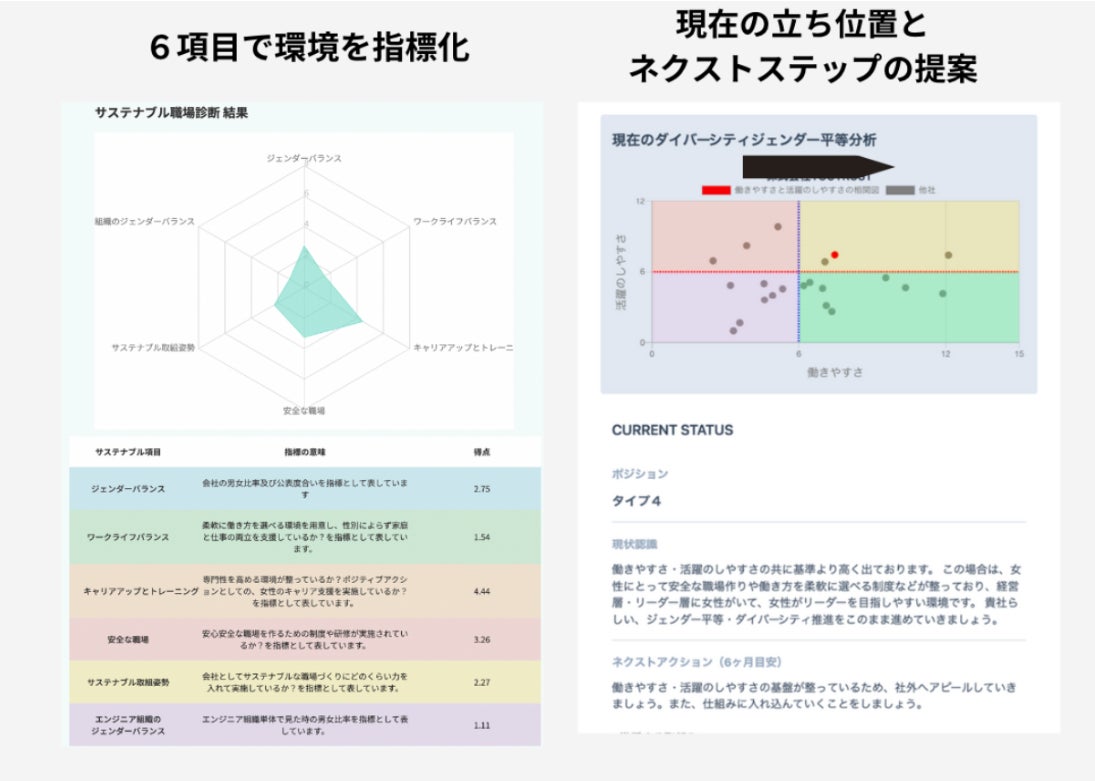 また、求職者である女性・ITエンジニアは、サステナブル職場診断の結果に基づく指標を参考に、ロールモデルがいるか・専門性を高める支援があるかなど「活躍のしやすさ」や、組織に心理的安全性があるか・柔軟な働き方ができるかなどの「働きやすさ」を軸に企業を探すことができます。