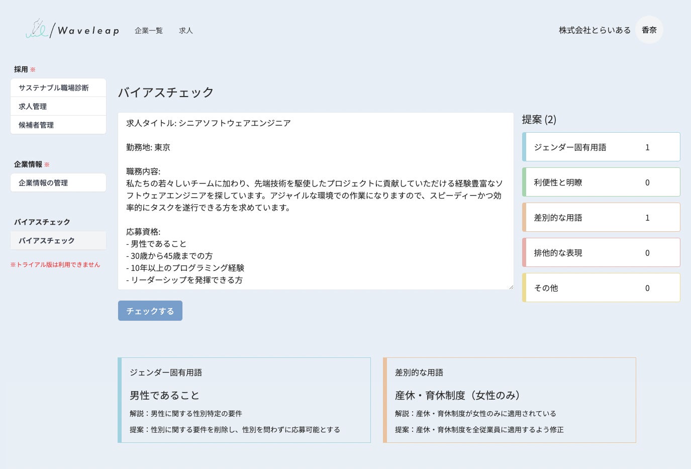 企業と求職者の接点となる求人票や、求職者とのメッセージでのやり取りの中に、ジェンダーバイアスを含む表現や文言が無意識のうちに含まれてしまうことがあります。そこで、OpenAIを活用した「バイアスチェッカー」で分析・適切な表現を提案することで、ジェンダーダイバーシティ推進を支援します。以下ページにてお試しいただけますので、是非ご覧ください。