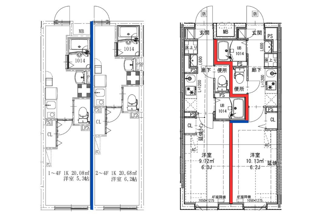 ※青色=コンクリート 赤色=乾式耐火遮音壁