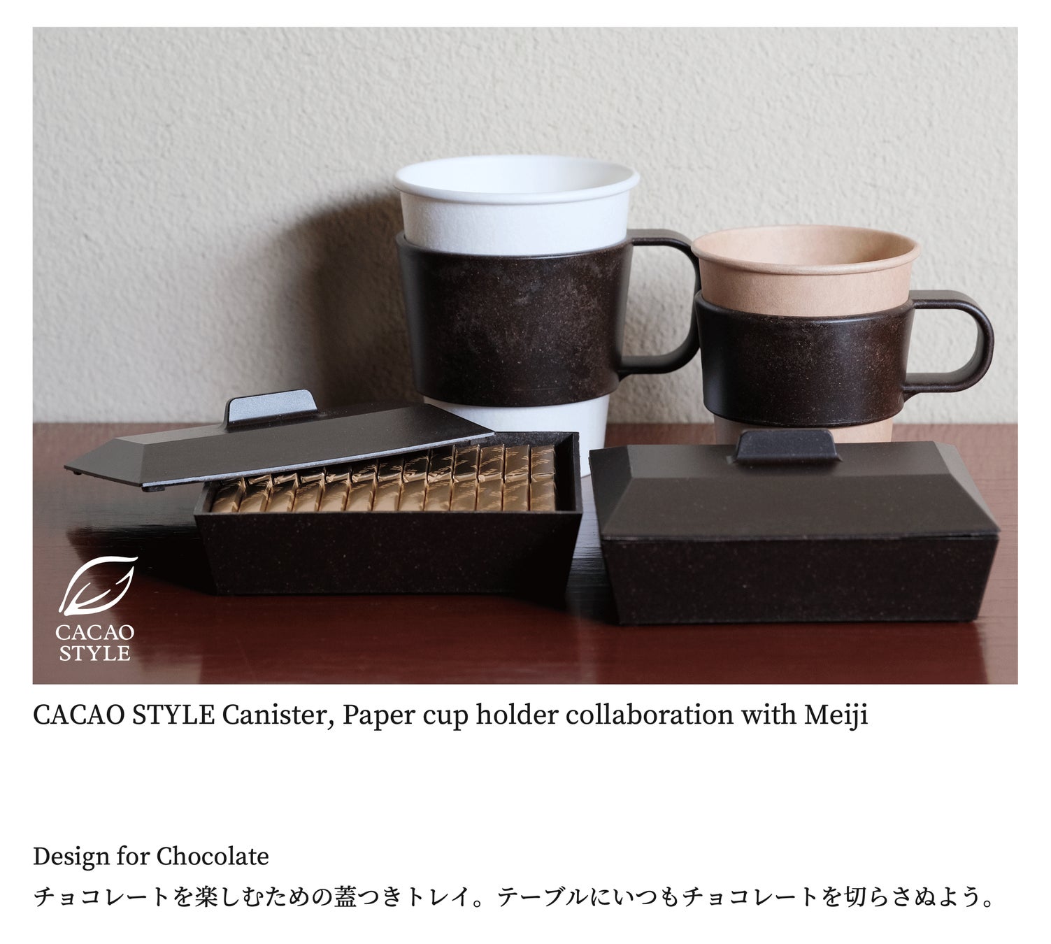 「CACAO CAFEシリーズ」は、チョコレート好きのためのフタ付きトレイ「CACAO キャニスター」蓋つきトレイ、紙コップを持ちやすくする「CAFE ホルダー(L、S)」があります。