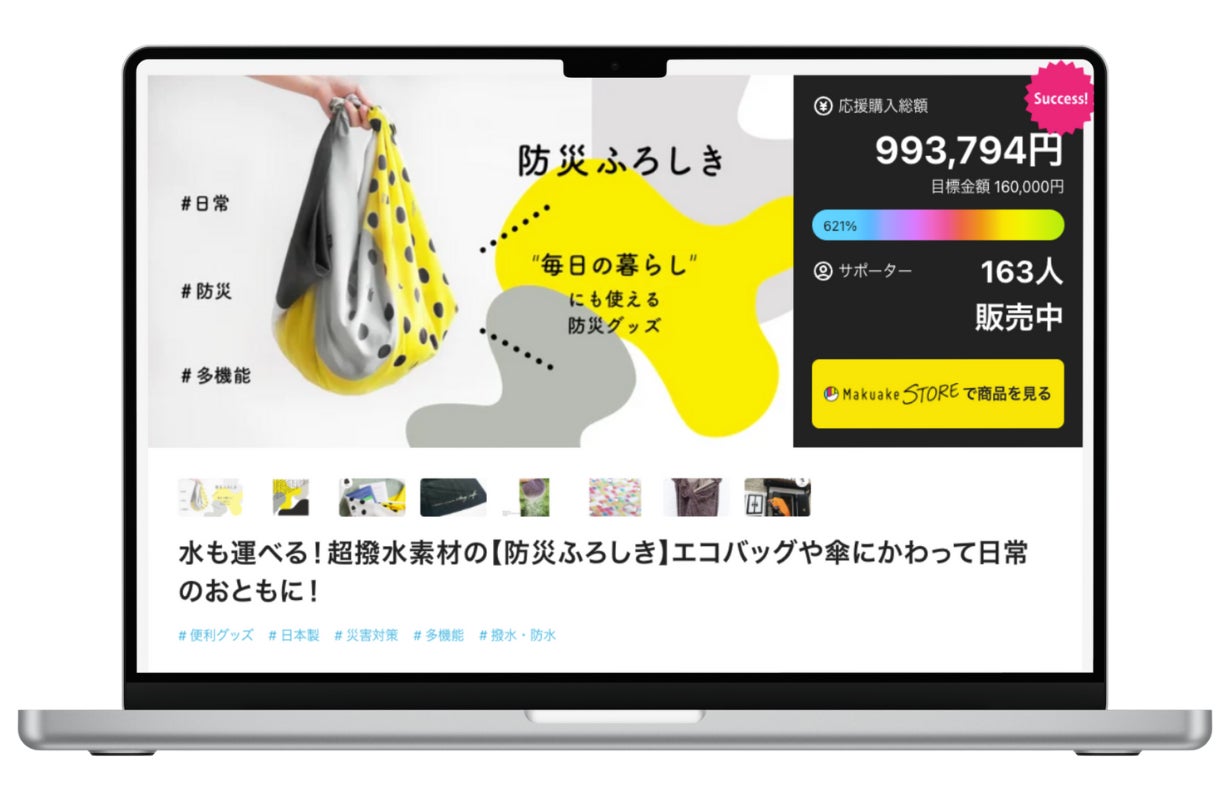 東日本大震災から10年の節目だった2021年に、被災経験のあるメンバーの体験から、日頃からの備えが大切ということを一人でも多くの方に伝えたいという想いから企画スタート。日常でも災害時でも使えるフェーズフリーなアイテム「Plannersの防災ふろしき」が実現しました。Makuakeでの先行販売では、163名もの方々に応援購入いただき、目標金額の621%を達成することができ、その後も多くのメディア等で紹介いただきました。
