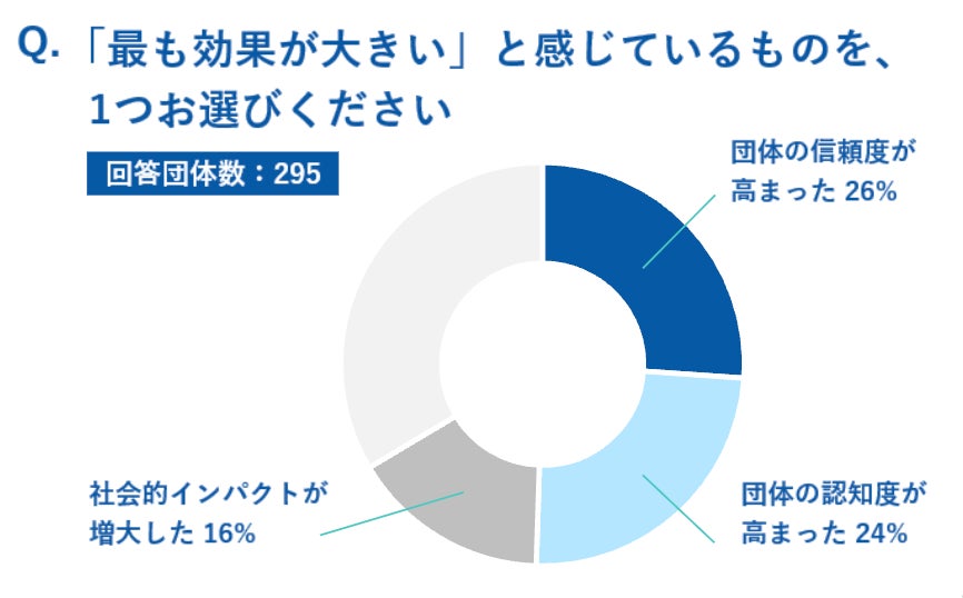 さらに、最も大きな効果として「組織内人材の責任感や運営意識の醸成につながった」を選択した団体も7%に上りました。“組織内人材にノウハウが蓄積され、運営意識が向上した”、“普段の活動に対する責任感がより生まれるようになった”といった具体的な回答が見られ、人材育成や組織運営といった面も含めた、企業との協働による多層的な効果が明らかになりました。