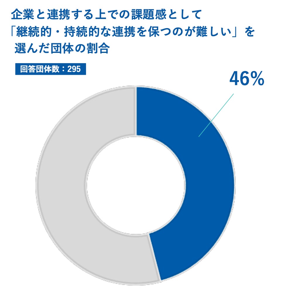 企業と連携している団体のうち、協働する上での課題感として当てはまるものをすべて選択する設問では、「継続的・持続的な連携を保つのが難しい」を選んだ団体が最も多く46%に上りました。このほか、「団体内に企業との連携を担当できる専門的な人材がいない」「連携にかけられる時間が少ない」「連携にかけられる予算が少ない」が上位に挙げられましたが、「課題だと感じたことはあまりない」と答えた団体も2割ほどいました。