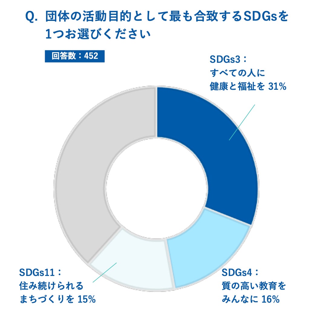 団体の活動の目的に最も合致するSDGsとしては、「3:すべての人に健康と福祉を」を選んだ団体が31%で最多となりました。これに「4:質の高い教育をみんなに」「11:住み続けられるまちづくりを」が続き、一部で順位の入れ替わりがあったものの、前回調査(2023年)結果と同じ3つのSDGsが上位に選ばれています。