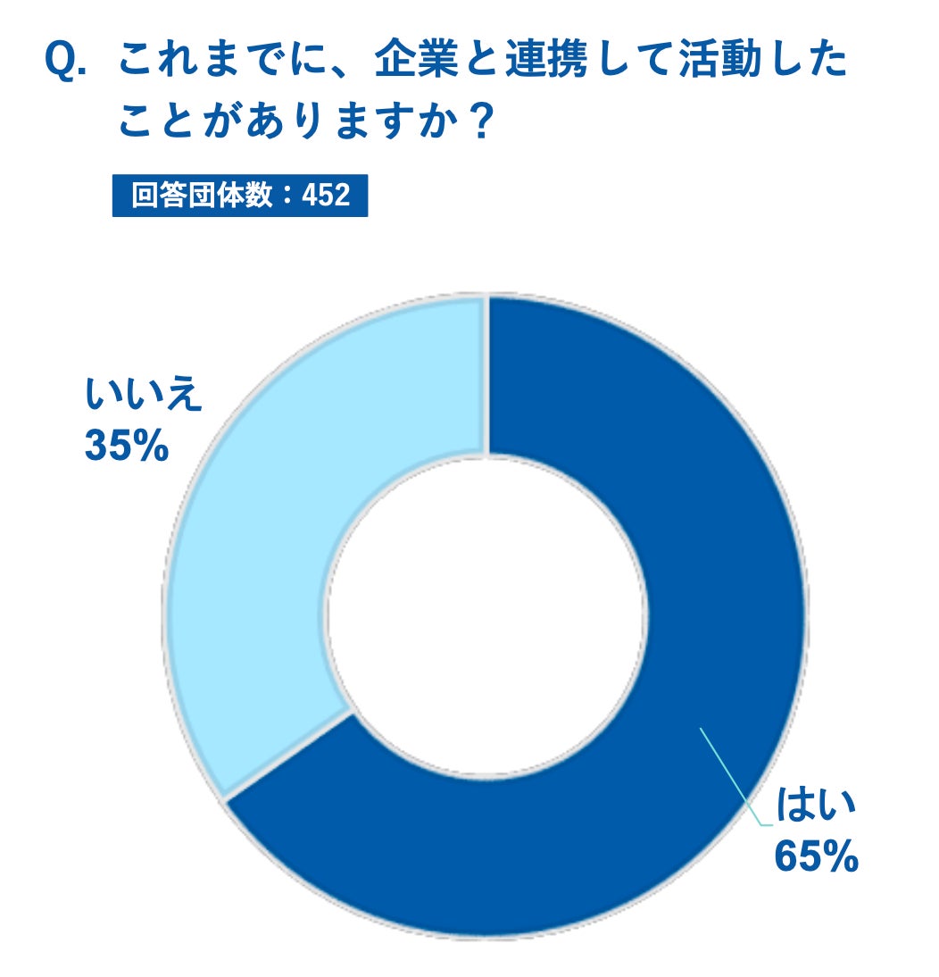 「企業と連携して活動したことがある」と回答した団体は、295団体で65%となり、初回(2018年)調査結果の約4割、前回(2023年)調査結果の約6割から増加し、過去最高となりました。