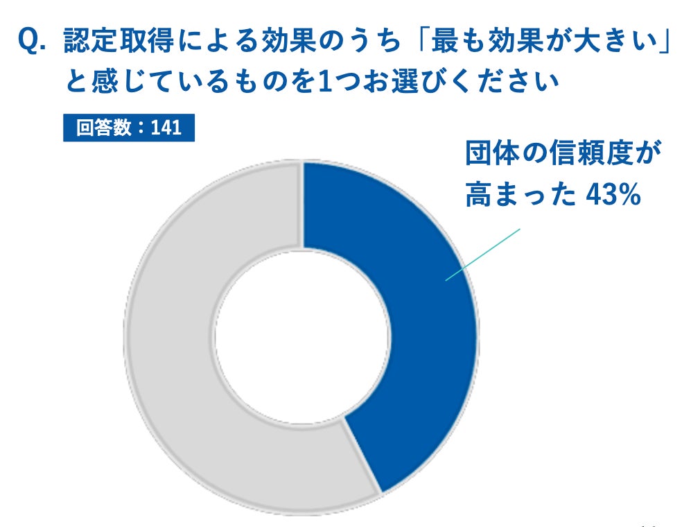 認定または特例認定を認証された経験がある団体は合わせて141団体で、全体の約3割に上りました。このうちの43%が認定取得による最も大きな効果として「団体の信頼度が高まった」を、13%が「団体内人材の責任感や運営意識の醸成に繋がった」を選び、いずれも5段階評価においても中央値が4と最も高くなっています。