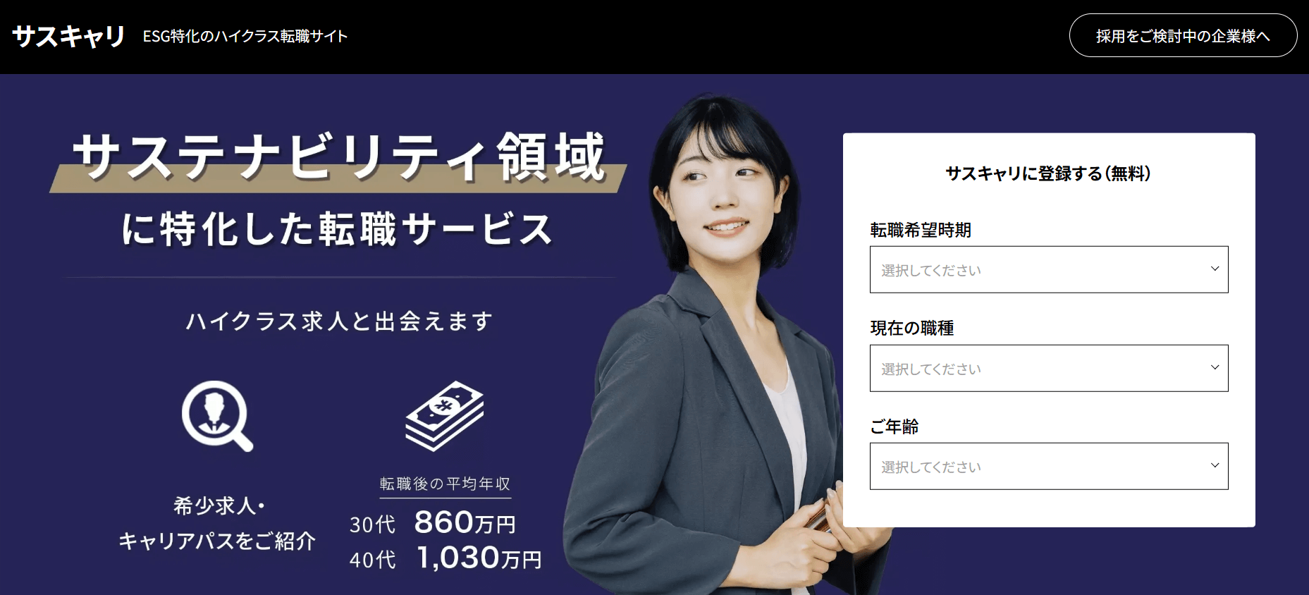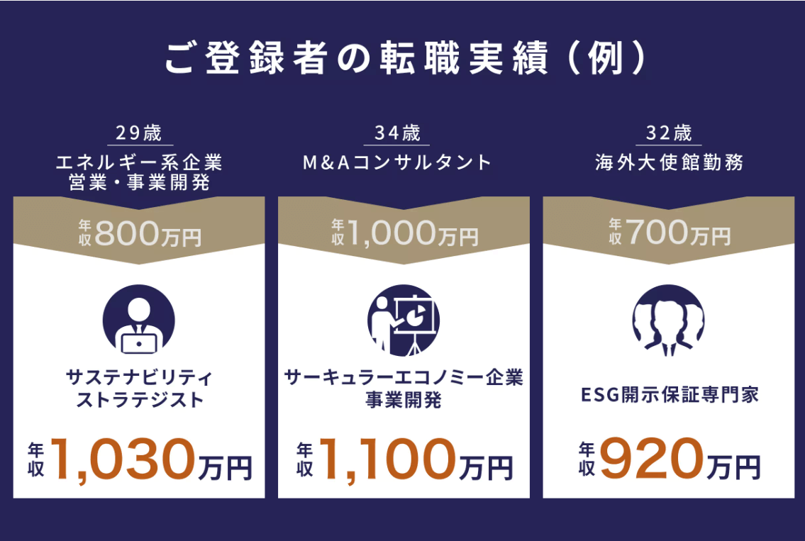 まず、サスキャリは「ESG・サステナビリティ分野に特化」し、ハイクラスの求人を多く扱っている点が大きな特徴です。実際に、利用者の平均年収として30代で約860万円、40代で1,030万円といった実績も報告されています。