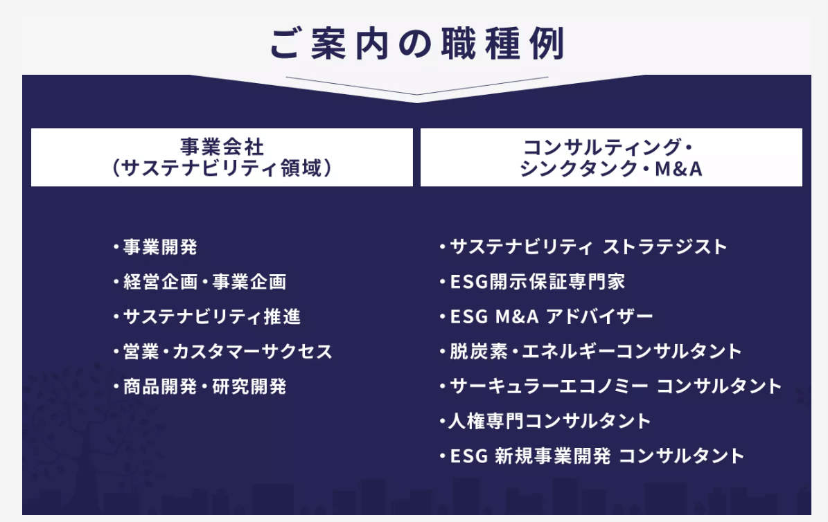 具体的には、企業のCSR・環境部門、ESG推進担当、サステナビリティ企画・管理、非財務情報開示、IR(環境・社会・ガバナンス)担当、さらにはサステナビリティコンサルタントなども含まれています。